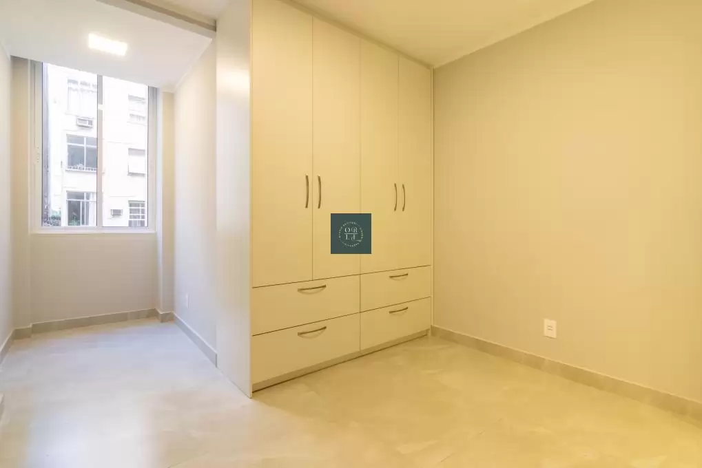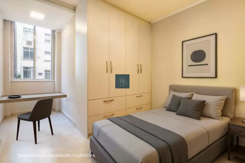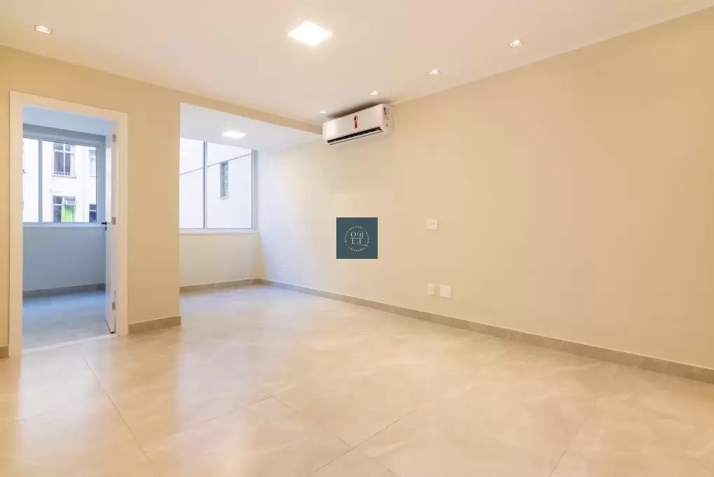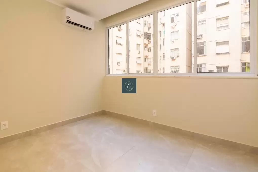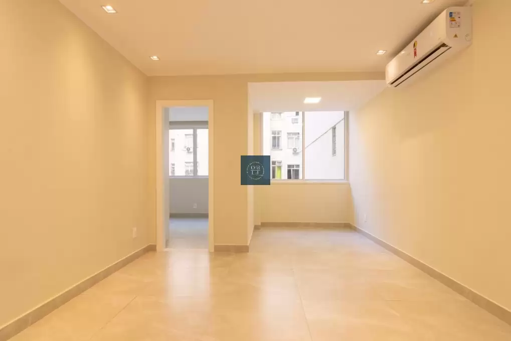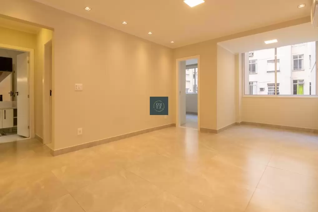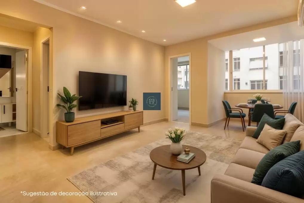 pleno coração de Copacabana. A sala em dois ambientes, revestida com porcelanato