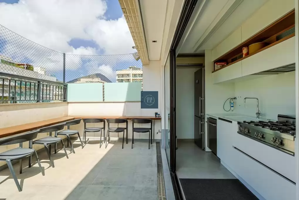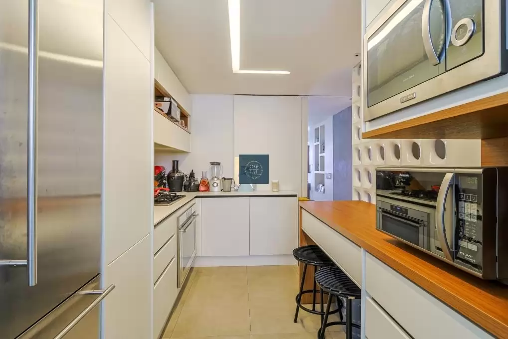 o céu; cozinha gourmet totalmente equipada e banheiro social. Ambiente com